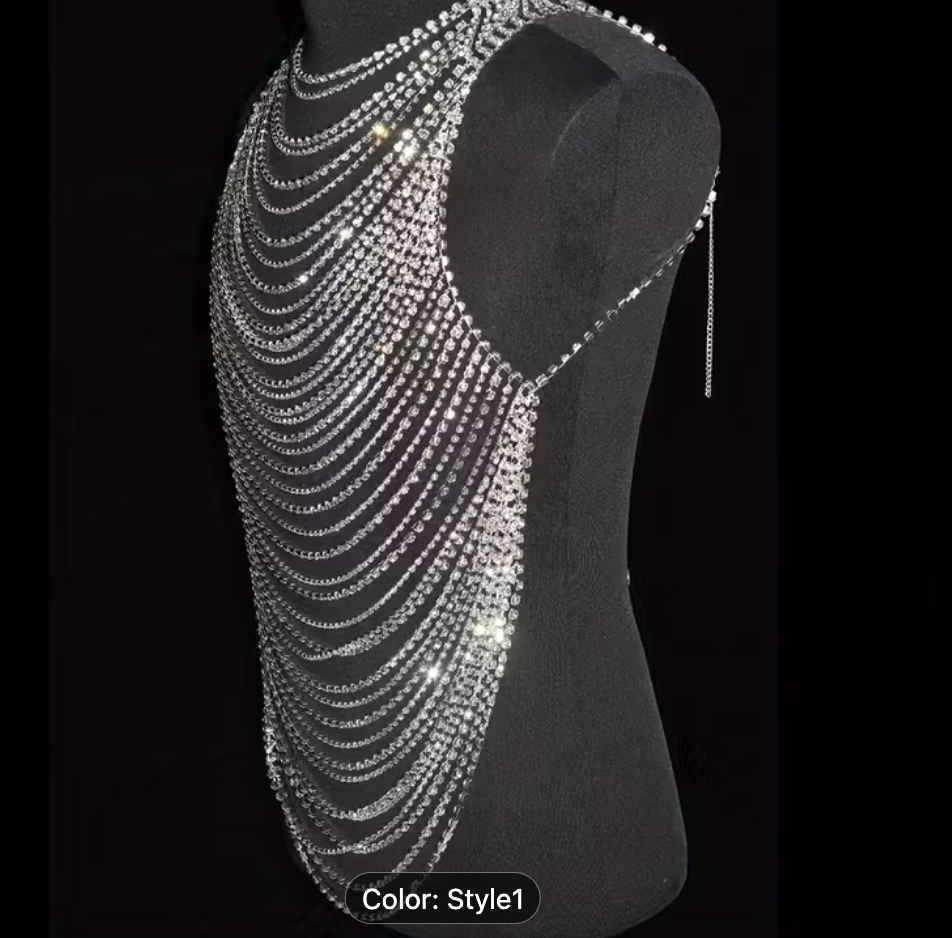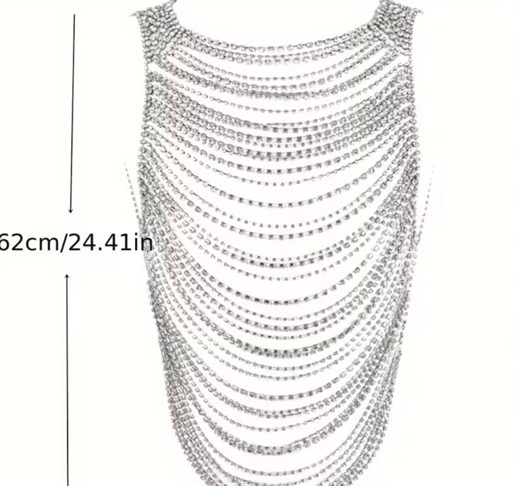 Multi-Layered Rhinestone Chest Chain - Shiny Sexy Party Body Chain for Men and Women - Nightclub Belly Chain Music Festival Outfit.