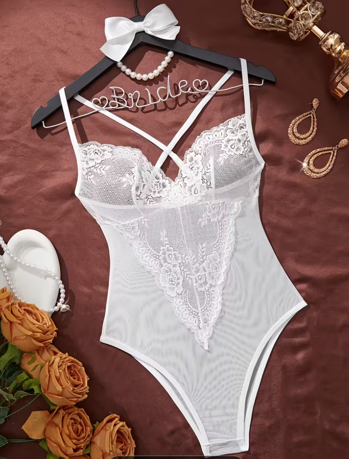 Women'S Sexy Lace Mesh Bodysuit, 90% Polyester 10% Elastane, Solid Color, Light Support, Knit Fabric, Cross-Back Design, No Padding, Bridal Style, Adult - Elegant Lingerie