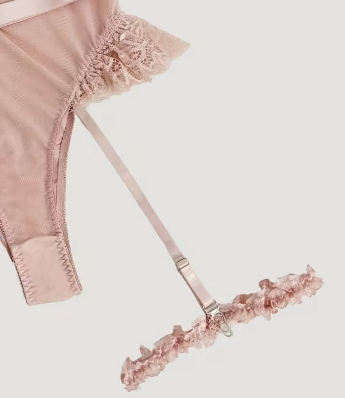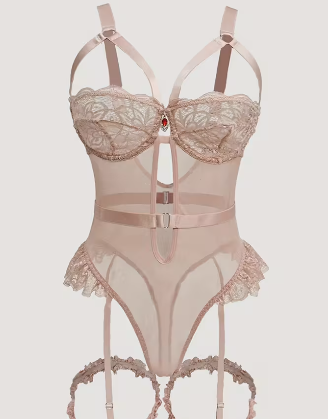 Plus Size Lace Bodysuit] Elegant Plus Size Contrast Lace Hollow-Out Sheer Garter Bodysuit with Underwire | Sexy One-Piece Outfit Includes Belt.