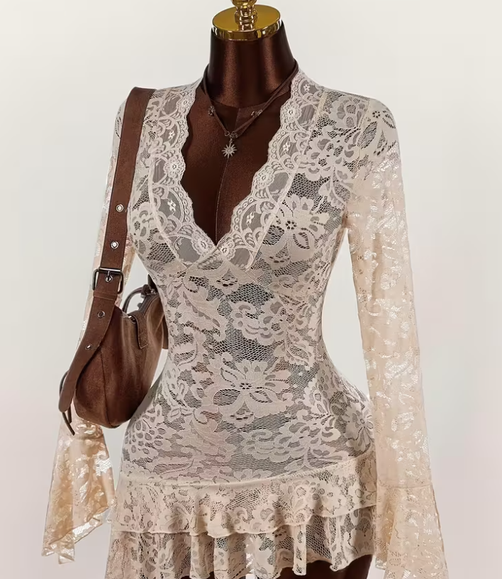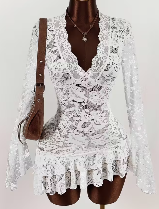 Lace Hollow-Out Floral Mesh lingerie dress - V-Neck, Long Sleeve, Ruffled Hem, All-Season Wear for Women, Elegant White with Red Accents, Adult Size, Elegant Attire|Vintageinspired Dress|Ruffled Hemline.