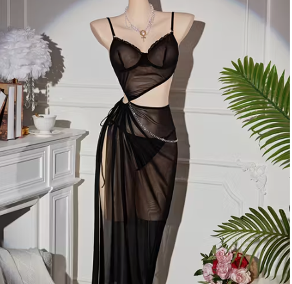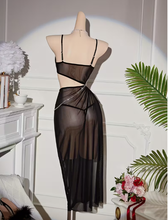 Sexy Sheer Mesh Chain Suspender Lingerie Dress for Women - Elegant Low-Cut Design with Backless Detail, Hand Washable
