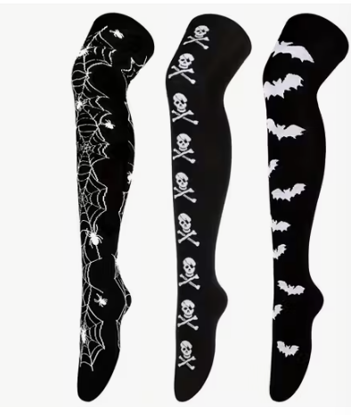 Halloween-themed skull and bat full-body print funny Women's over-the-knee socks