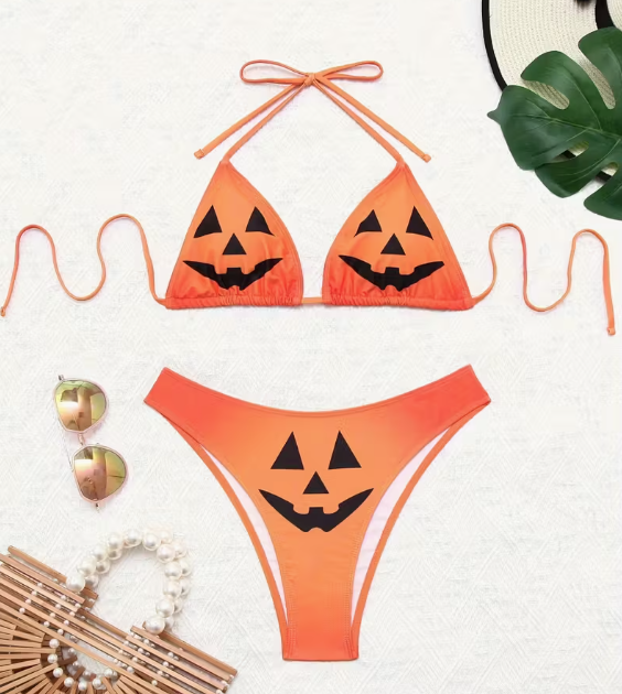 New Halloween fashion Halloween gift Pumpkin print fixed plate printed bikini swimsuit showing sexy curves