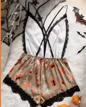 Women's Elegant Halloween Pumpkin & Bat Print Lace Romper Jumpsuit - V-Neck Sleeveless Nightgown with Crisscross Strap Back, Soft Comfortable All-Season Pajamas for Themed Parties & Casual Attire, Hand Washable (Golden/Black/Orange) - Limited Edition Elegant Sleepwear with Ruffled Hem & V-Neck Design, Non-Stretch Fabric, Cross-Back Closure, Adult Women's Loungewear for Halloween Celebrations, Halloween Costume