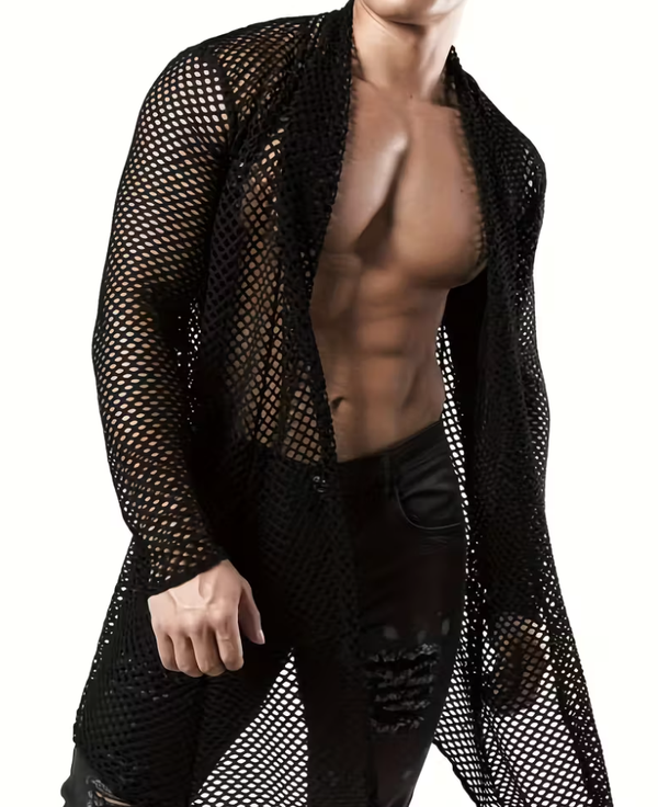 Men's sexy pajamas, Men's novelty clothing, hollow long-sleeved cardigan, European and American Men's street trendy shirt, long mesh hollow sexy see-through cardigan performance suit