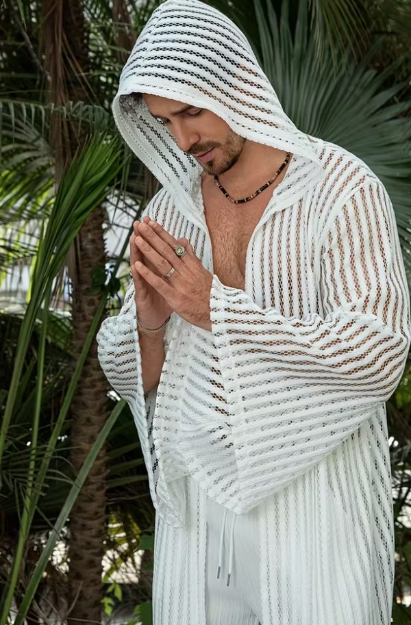 Soft Striped Robe, Soft Comfortable Men's Solid Color Striped Robe | Simple Fashion Casual Breathable Long Beach Pool Party Outfit.