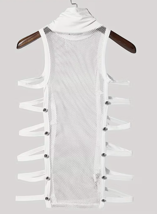 Men's Metallic Button-Front Fishnet Tank Top - High-Neck Sleeveless Shirt, Slim-Fit Clubwear Vest with Tummy Control for Nightclub, Party & Casual Wear - Durable & Easy-Care (Machine Washable)